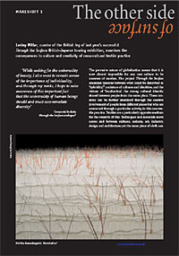 Much else, besides Helena Hietanen’s beautiful Technolace-making is weighted towards craft as much as design. A mix of futurist fiber-optic material and traditional Finnish lace-making forms, along with technolace, Representing Making, Katie Bunnell’s ceramics based CD-ROM work is reviewed, looking both at the increasing significance of new media to the world of pottery. In Make-Do, the occasional series guiding people on how to actually make artefacts, Simon Watts guides the reader on making children’s traditional Portuguese wooden toys. There’s an interview with the basket-maker Lizzie Farey, who creates lovely willow nests, and whose work sits half way between basketry and land and nature art. Lastly within Wordwatch a handwritten piece on Siberian reindeer boots, and the nomadic reindeer herding culture, part of the review of Spirit of Siberia.