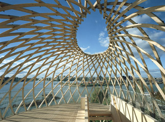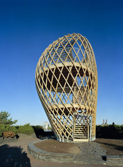up with a spiralling timber lattice structure meeting in an ovoid