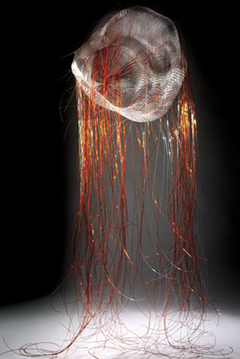 Certainly the sensibility of alien forms feels very present in the standout Through the Surface textile sculpture, ‘Transition’. Made out of fishing wire, it echoes a ghostly translucent red and white deep sea jelly creature, just as the organicism of its form also makes visible the previously unseen - a vastly enlarged detail of some invasive cell organism.