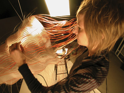 Amundsen was first drawn to textiles as a therapeutic activity, ‘to make the days go by’ while being treated for lymph cancer. She immediately enjoyed working with a loom and weaving, though soon wanted to take what she was doing several steps further, experimenting with all sorts of non-traditional new materials. These included pipe cleaners, rubber, cellophane, various elastics, metal chains, fluorescent plastic tubes, and electrical wires. Recently she has been working with more durable rubber materials such as silicone tubes and oil based rubbers like Nitrile. This has, she says, “a more abstract relationship to the body compared to natural rubber, but enforces the references to science and medical associations as well as creating a more other-worldly atmosphere to the pieces. Originally I wanted to cross some boundaries, using everything that could create an exciting meeting between the old arts and crafts tradition and myself as a young person, and was fascinated to follow the result that I got during the process.’