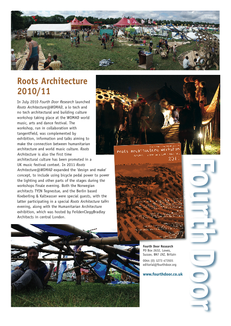 Round Two of Roots Architecture at WOMAD's Charlton Park was a sizeable leap into knowing what folks were doing compared to the first year. There were both old and new teams, and equally excitingly a whole new workshop presence pitching up in the shape of Electric Pedals and Cycletricity, who powered the stage, when we finally got to the finale evening performances. Participant numbers mushroomed in the twelve months from the first and the 2011 workshops.tangentfield, Fourth Door's Roots Architecture partners, had devised what they envisaged as a Structural Game of Consequences, a monster creature connecting all four teams together. For tangentfield this was about each team negotiating with each other on exactly where each structures joined each other – Berlin based newcomers, arch-art actionists Folke Kobberling and Martin Kaltwasser decided to use a tractor-trailer as the (mechanical) heart of their structure. Old boys TYIN decided on a full participatory strategy while Bamboo Jack and cohort created a will walk through and Architecture Sans Frontieres made a long pallet based tail.