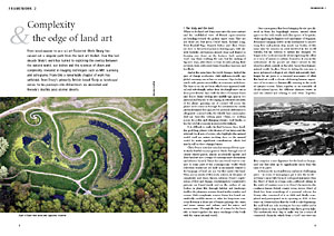 In FDR 2/3 an in-depth interview with land artist Chris Drury, looking at his work with wooden vortex, kayak and other structures. There’s a feature interview with algorithmic or generative arts Godfather, William Latham, discussing organic form, virtual and embodied sculpting, and the possible green uses of his mutator programme. In FDR1 there is a photo-piece on the land artist Simon English of the artist’s Camomile Swan, grown and mowed from a field of camomile. Alongside this, appearing in Wordwatch, but with arts resonances, is a review of American video-artist Paul Ryan’s, Video Mind, Earth Mind, using video for sensitising humans to ecological systems. Another version of this widening of environmental art categories is the in-depth Re-Read review of Michael Tucker's book Dreaming With Open Eyes, which explores the shamanistic dimension of twentieth century modernist art.