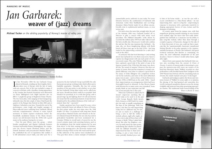 FDR7 focuses its MoM energies on the master of Nordic atmospherics, and defining voice of the ECM records, Jan Garbarek. The article written in the aftermath of Garbareks 2004 tour and album In Praise of Dreams is by biographer and long time Garbarek aficionado, Michael Tucker.
