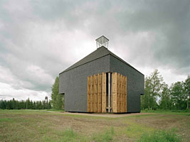 Kärsämäki, 125 south km of the city. Part of the competition requirement was for the Church to use 18th century materials and methods, leading Lassila to develop a traditional hand-sawn log construction. An exercise in hand skills, much of the timber frames were felled from the village’s own woods, partly transported by horse, with frames raised beside the church. Axes hewed many of the inner and outer pine log surfaces, while the façade was clad in 50, 000 aspen shingles. The exercise in pre-modern construction was continued once the Church was built, with no electrical points - light coming from the lantern on the roof of the building, and candles once darkness descends.