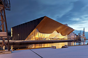 So far ALA, apparently Latvian for ‘cave’, have produced one major project, albeit one which has received a bundle full of press in the European architectural media, Southern Norway’s Kristiansand Performance Centre. The centre is divided into two parts; the first part of the building is the entrance foyer area, dominated wavy undulating timber roof, extending far out over the quayside entrance, alluding to the Northern Lights aurora. Inside, this front of house foyer area is separated from the interior concert halls and performance rooms the secondary section of the building. The performance and back stage area are described by architect Nousjoki as similar to a factory, designed structurally around a steel skeleton. In their downtown office, a converted sausage factory, Nousjoki, runs through the building and its successes, and how it broke the rules of Nordic architectural production by, as puts it, “placing a ‘factory’ and public building together’ before also throwing in a put down of Aalto; ”The acoustics of Finlandia was one of his biggest mistakes.”