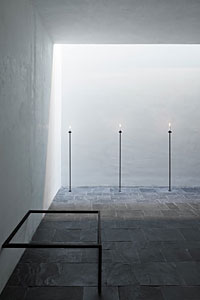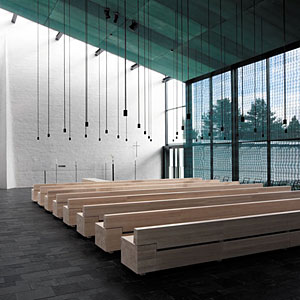 With three differently sized chapels, entered individually along separate processional corridors from the front, past water ponds and quietly growing gardens, the careful labour Avanto had invested in crafting this solemn but light building became apparent. The floors are of slate, a powerful contrast to white walls, and brown pews of seating, designed again by Avanto, complemented by an exquisite use of turquoise copper on the ceilings and as fenelated wire curtaining at the back of the chapels. As with the careful choice of colour, the simple, though effecting block-like stools that Avanto have crafted, brings human warmth to the building.