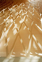 A rethink began. Lassila and Hirvilammi arrived at a compromise design decision. There would be two structures, a primary load bearing structure comprising a 13 glulam timber frame truss to hold up the roof and building, and a secondary gridshell lattice, which, no longer structurally necessary, would remain for primarily aesthetic and decorative purposes. Today Hirvilammi acknowledges that they weren’t at all sure about continuing with a notional gridshell, in order to make the building look good. It seemed to defeat the object. “When it is only a secondary structure what is the point of it?” he states rhetorically, recalling how they spent many days drinking coffee arguing the merits of keeping or not keeping the lattice. “We were very critical. But in the end we decided it was just visually so strong, that we agreed it should be there.”