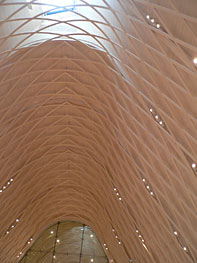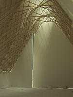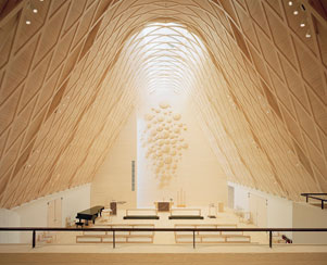 There was no particular idea of wanting to ‘do a gridshell’, he says, waiting until the right project came along. Rather, the idea, when it came, originated quickly, as they began working over the summer 2006 with their junior architectural partners, Oulu’s Luonti Architects, on the new church competition. The Downland Gridshell studies had been absorbed and the idea of a structural gridshell structure “captured our attention just before the competition. There was the possibility of a rich structural interior, and also it felt like the right context.” There were other pragmatic reasons. As a structural canopy, the lightweight shell worked well to unify the disparate floor plan, divided into three parts while also visually compelling. Last, but not least, a gridshell felt like an apt structure for a church, which the pair already had a background in.
