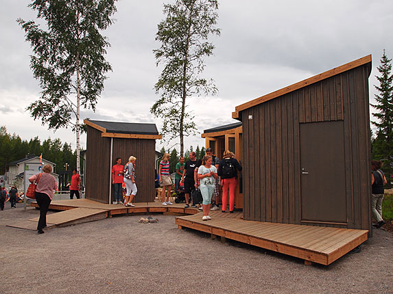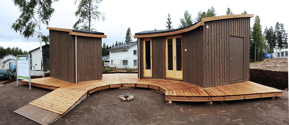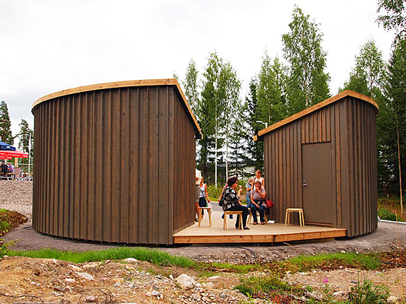 The Piiri house is designed as a modular system which can be expanded incrementally depending on location and use. The circular plan is divided by a radial grid that defines the dimension for all spatial units. The smallest configuration of the system includes only two units, one with a bathroom/kitchen and the other with space for sleeping. By adding additional units, space for sleeping, storage, guests and even a sauna can be included.