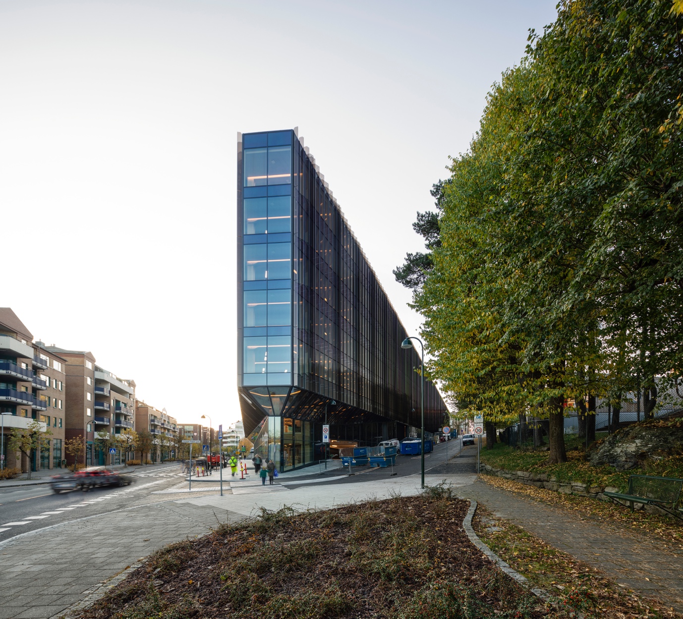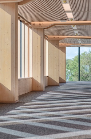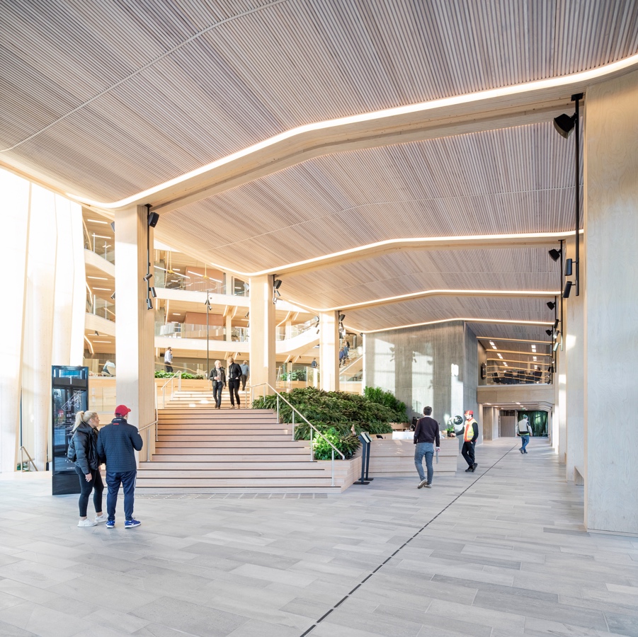 Project architect, Njål Undheim, began on Finance Park after HHA, together with the SAAHA Architects, won the limited competition in 2014. On-site work beginning in October 2016 was followed by a further 18 months from when the timber post and beam system began going up in March 2018. From outside, the building, despite the ground floor-to ceiling glazing presenting the glulam post and beam interior to pedestrian passers-by, doesn’t fully show off its timber credentials. Taut rows of black 42cm fins run the lengths of the 80m outward facing V-winged facades, fitted with a Schüco CTB (concealed toughened blind) micro-louvre passive solar shading system. To the back of building, problems emerged during early groundwork and consequently the car park entrance required slimming the corners down as much as technically possible, while pulling in the cantilever overhang.