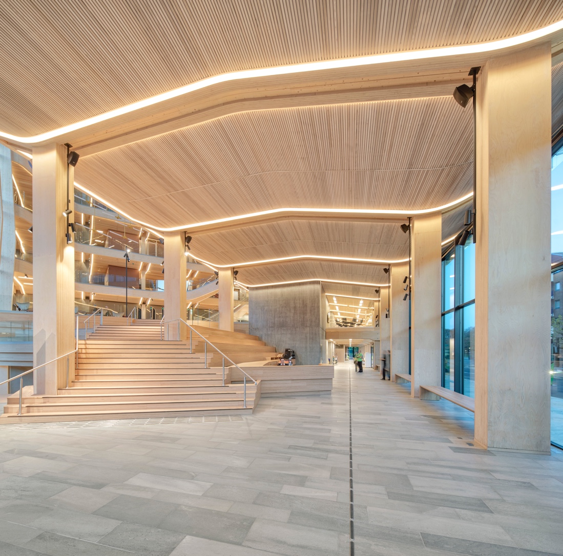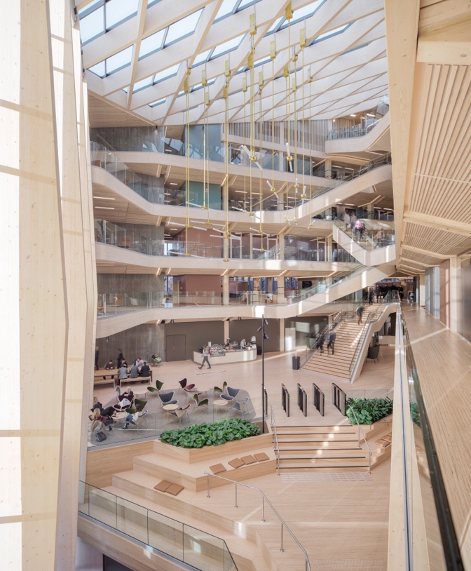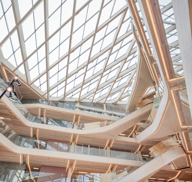 The four staircases, two from each side doubling as walkway bridges between the wings, climb and curve upwards and amplify the expressionistic organicism of the wavy ceiling panels above the ground floor corridors. “We struggled a lot with the stairs,” says Njål. Veidekke, one of Norway’s large building companies, and the contractor, at first said they couldn’t be built without columns, which meant reworking the complicated piece of timber design, says Undheim, eventually smoothing out the problems after serial delays, which also stalled the 6 tonnes of BauBuche timber lattice joining and stabilising the two structural wings, and sits high above the atrium.