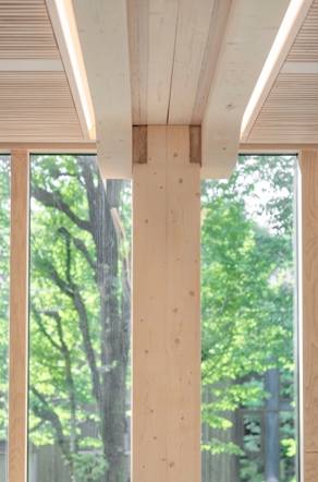 For those who already know Blumer’s work, once inside the timber joints and details will feel familiar. Beyond the foyer entrance, the ground corridor runs the length of the building, large glulam timber columns and beams holding the roadside face of the seven-floor building - immediately recognisable and reminiscent as they are Blumer’s signature structural system, which already debuted to striking effect with Shigeru Ban’s Tamedia HQ – see the accompanying feature on the project here - in downtown Zurich. For Njål, the structure extends and expands on Blumer’s Tamedia post and beam system, including the seemingly over-size dowels, rather than the usual conventional steel node connectors specified across the industry, though for Finance Park the dowels are somewhat smaller than with Tamedia.