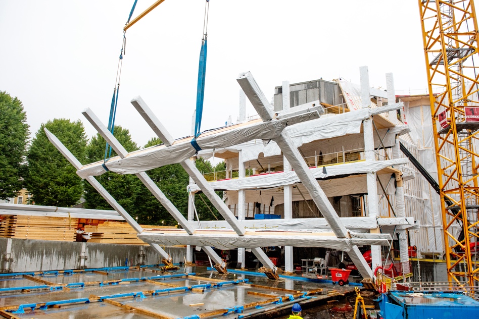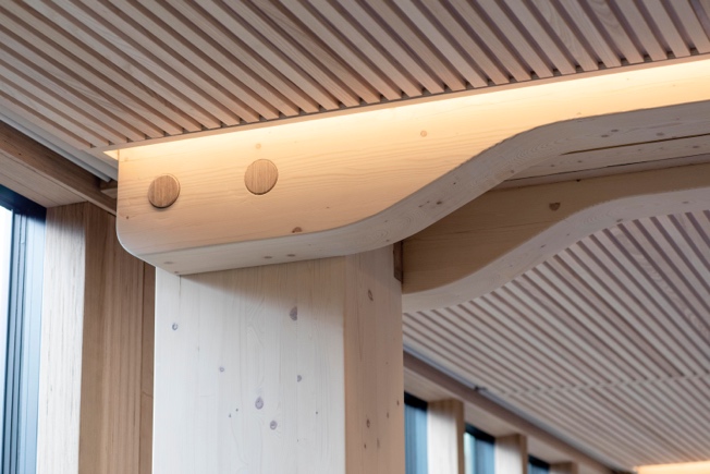 Unlike most timber buildings Blumer’s system requires a section by section, rather than floor by floor, construction programme, beginning with the facades and roof, with the façade shade mounting running in parallel. Different engineered timbers demonstrate technically how applying a mix of materials to make for an efficient structure. This included Glulam for the staircase from German manufacturer, Hess Timber, near Frankfurt, the remainder supplied by the Norwegian manufacturer, Moelven, to make up the chunky post and beam system. Pictures of the dowels being malleted into place give an indication of the sheer size. The beams include a wavy curve, with lighting sitting in ridge and furrows. All told, 1900 m2 of CLT has been hidden away in floor and ceiling plates, with much of the services, including ventilation ducts, hidden inside the timber, on the third floor, diffusing the ventilation. BauBuche LVL (laminated veneer lumber), increasingly popular among architects because of hardwood birch’s strength, reduces the size of timber needed, with 600m2 of the thinner, more compact panels used. “The BauBuche prevents the size being too huge, it is double the strength of glulam, also used to strengthen the connections” notes Njål - the whole façade system with the LVL inside and the aluminium profile fastening to the glass. There is also 8000 m2 of ash for the exposed ceilings, in all 3600m3 of timber, representing, according to the publicity 2750 carbon tonnes as part of a LCA - conducted by Niras, but without any information on the methodology used - sitting in the timber. Much of the wood is UV protected or otherwise non-toxic, although the ceilings are fire-protected, a requirement of insurance approval.