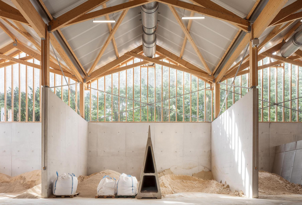 The production facility opened in December 2021. Almost a factory, and run as a Co-operative Collective, the Cycle Terre factory’s large open space is comprised of a set of raw earth storage bays, several pieces of specialist machinery, and further post-production storage bays. Set in an industrial estate with industrial warehouses each side, Cycle Terre stands opposite two neighbouring buildings, which at the time of my visit were, somewhat weirdly, being converted into an evangelical church and a mosque. The building, in effect a four pitched roof shed, with first floor admin and lab rooms, was designed by the now disbanded Paris studio, JolyLoiret Agence d’Architecture, whose co-founder, Paul-Emmanuel Loiret is an earth materials advocate and president of the Cycle Terre team. A primarily wood frame structure 12 metres high, featuring both compressed earth bricks and experimental earth coated panels. “It is mainly natural materials,” Loiret emphasises over the phone some weeks after my visit. “We wanted to make it open to the environment, so people could see what is happening in it, not a building closed off to the public.” The small scale of the multiple roofs is, continues Loiret, to emphasise the local in local production, and help spur a countrywide network of decentralised earth hubs into existence.