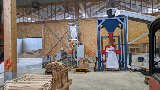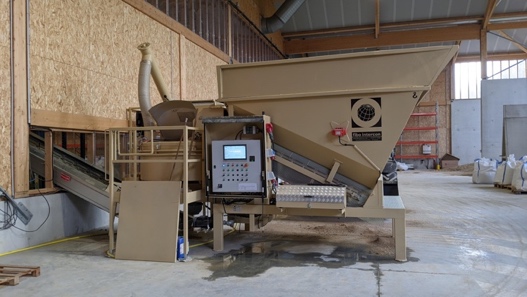 Devescovi and I walked from the back of the building to the large front bay area. We passed a robot arm sitting mute. When working, conveyer belts move the mixes from the unit to the CEB Press and Robot Arm for CEB production, or, if producing plaster and mortars to the Big-Bag Filling Station (developed by another company, Mecabag). There is a last independent machine; a bagger, to make bags of 25kg of mortar and plaster.